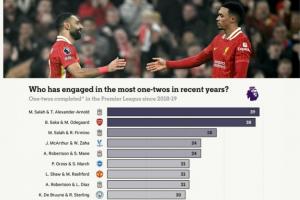 TA统计2018/19赛季以来英超二过一配合次数榜单↓