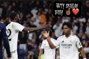 吕迪格社媒写道:“生日快乐,Bobby(恩德里克昵称)🤞❤️!”